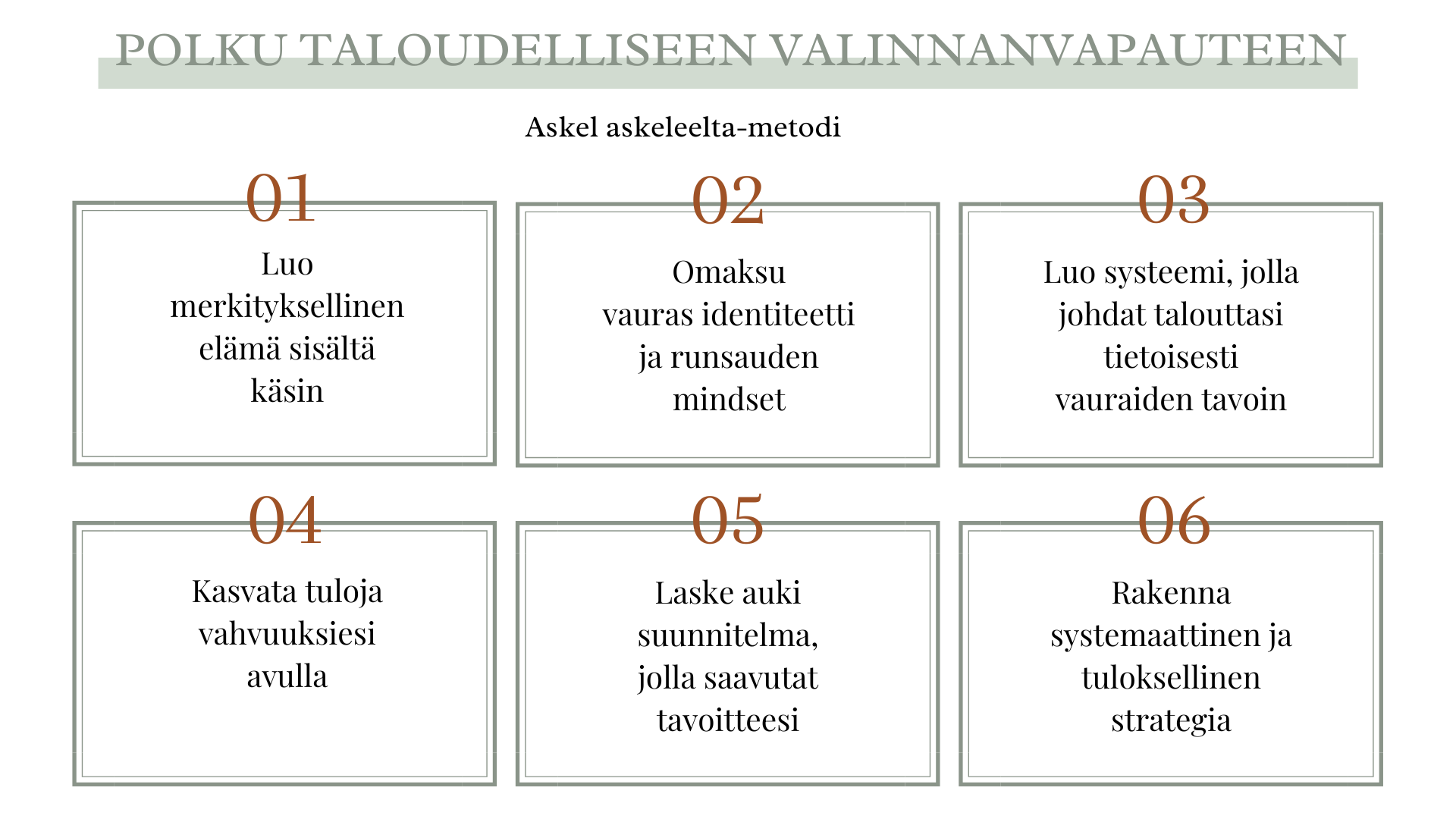 Jotta voit elää taloudellisesti vapaampaa ja merkityksellisempää arkea omilla ehdoillasi, tavoitteellisen sijoittamisen, vauraan talouden johtamisen ja ratkaisukeskeisen valmentamisen avulla.